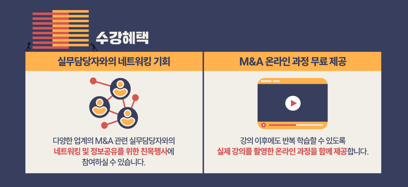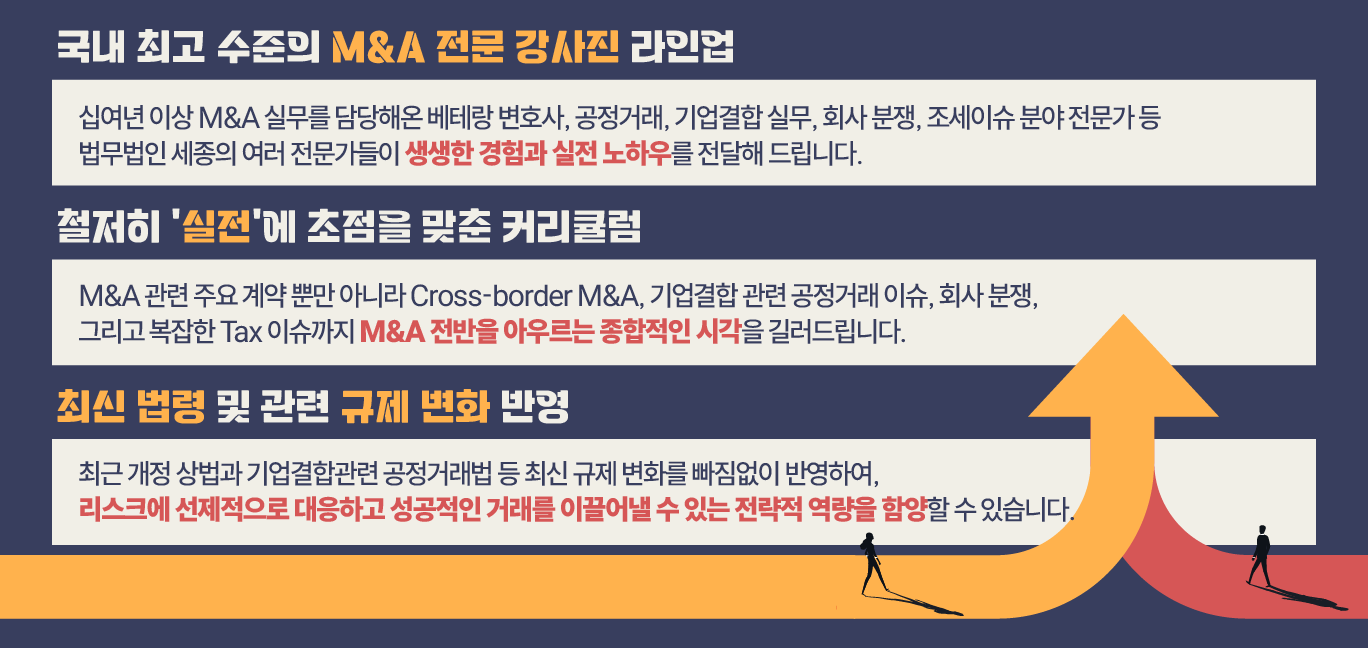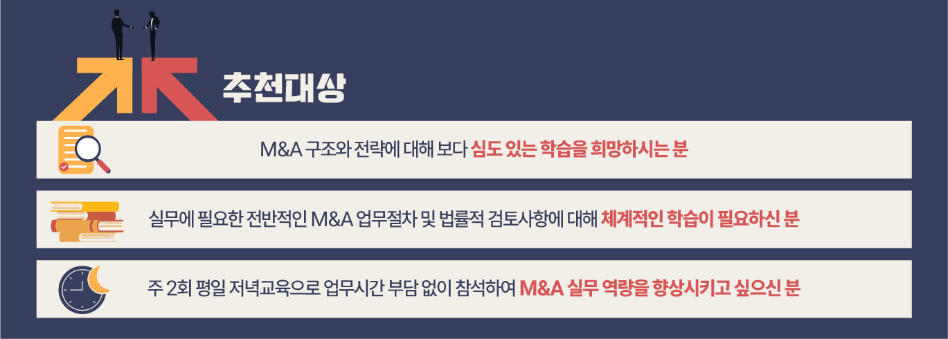 대 상 | M&A 관련 업무를 담당하는 기업 실무자와 사내 변호사, 투자, 벤처캐피탈, 자문사 종사자, M&A에 관심있는 경영진 및 관리자 등 |