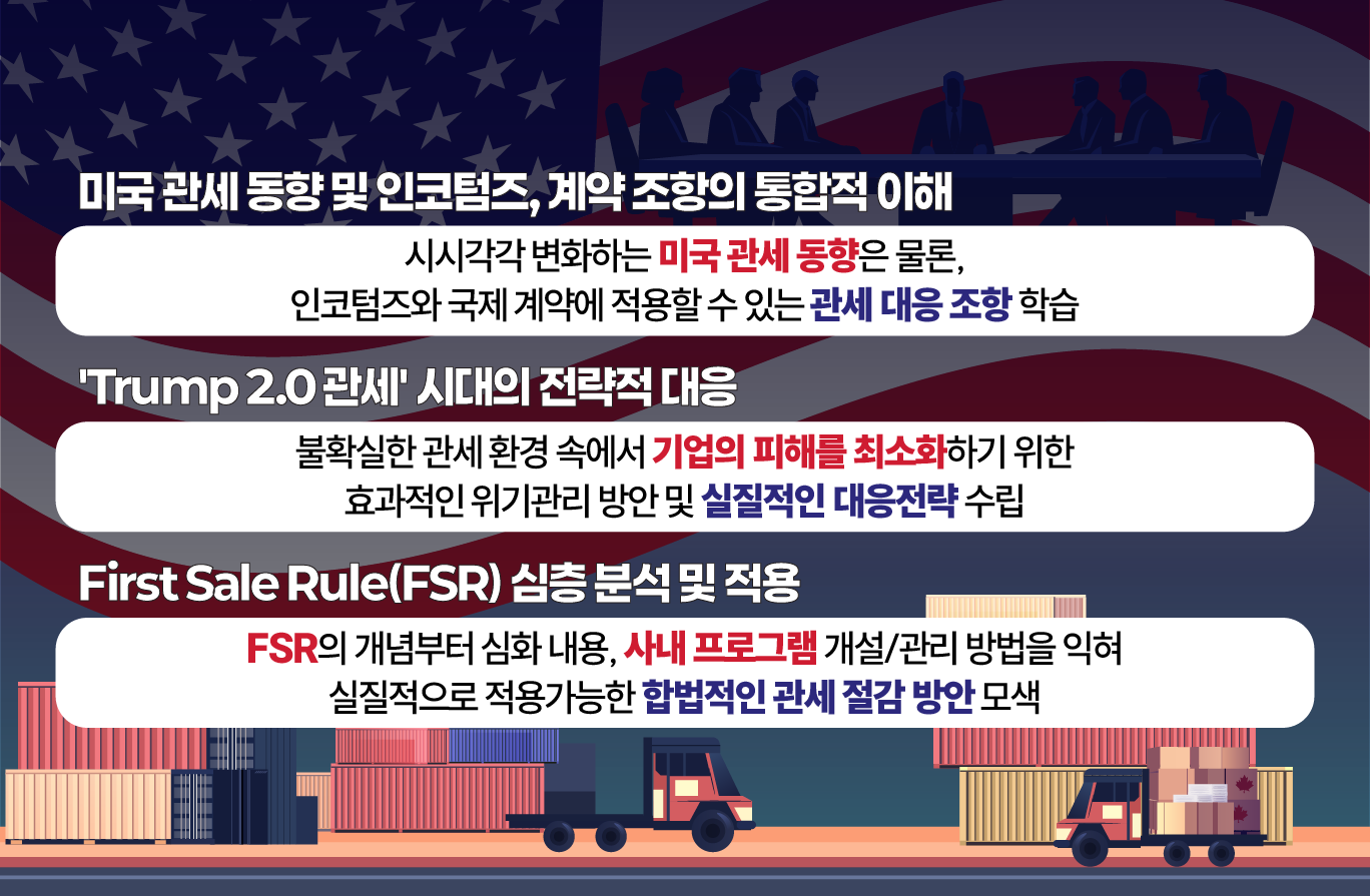 최근 미국의 관세 부과 조치가 수시로 바뀌고 있으며, 특히 무역확장법 232조의 영향으로 철강 · 알루미늄 및 그 파생상품, 자동차 부품 등에 최소 25%에서 많게는 50%까지 관세가 부과되고 있습니다. 이에 국내 기업들은 미국 정부가 높이고 있는 관세 장벽에 대한 시기 적절하고 전문적인 대응이 필요한 상황입니다. 단순히 ‘Transshipment’라는 명목 만으로 ‘40% 관세 페널티’ 가 부과될 수 있으며, 이는 미국법에 따른 ‘미국 CBP 원산지 증명방식과 가치평가’에 따라 그 결과가 좌우됩니다. 더욱이, EU 등 타국 역시 관세장벽을 높이려는 시도를 보이며 도미노 현상이 우려되는 만큼, 이전에 간과하기 쉬웠던 각 국제계약의 요소들을 이제는 반드시 관세 관련 리스크와 함께 면밀히 조율해야 합니다. 만약 관세관련 리스크를 분석하여 국제계약에 반영하지 않으면 ‘전문가 과실(malpractice)’에 해당될 수 있기 때문에 미국 관세 대응을 위한 전문적인 최신 지식 및 노하우를 함양하는 것은 선택이 아닌 필수가 되었습니다. 이에 톰슨로이터에서는 통합 수 조원 대의 다양한 글로벌 프로젝트를 성공적으로 주도하고 관리해온 미국변호사의 실무경험과 성공사례를 바탕으로, 국제 계약 관리를 통한 관세 리스크 절감 방안을 제시하는 특별 강연을 준비했습니다. 해당 과정에서는 'Trump 2.0 관세' 시대에 기업의 수출입 및 법무팀이 필수적으로 정비해야 하는 주요 국제 계약 조항들을 심도 있게 다룹니다. 더 나아가, 최근 산업부 주관 컨퍼런스에서 소개된 ‘First Sale Rule’ 등 합법적인 미국관세 절감 컨텐츠를 세부적으로 다루어, 기업의 담당자가 직접 FSR 프로그램을 사내에 개설하고 관리할 수 있는 실무역량을 제고하는 것을 목표로 기획되었습니다. 기업의 국제거래 및 계약 담당자분들께서는 본 강연을 통해 실무자가 기본적으로 숙지해야 하는 국제거래 조항에 대해 체계적으로 살펴봄과 동시에, 급변하는 미국 관세에 대한 리스크 관리 및 대응 전략을 수립해 보시기 바랍니다. (해당 과정은 향후 BD 단계에서 미국관세와 관련된 다양한 이슈를 파악하고, 사업구조와 프로젝트를 구상하는 데에도 큰 도움이 될 것입니다.) |