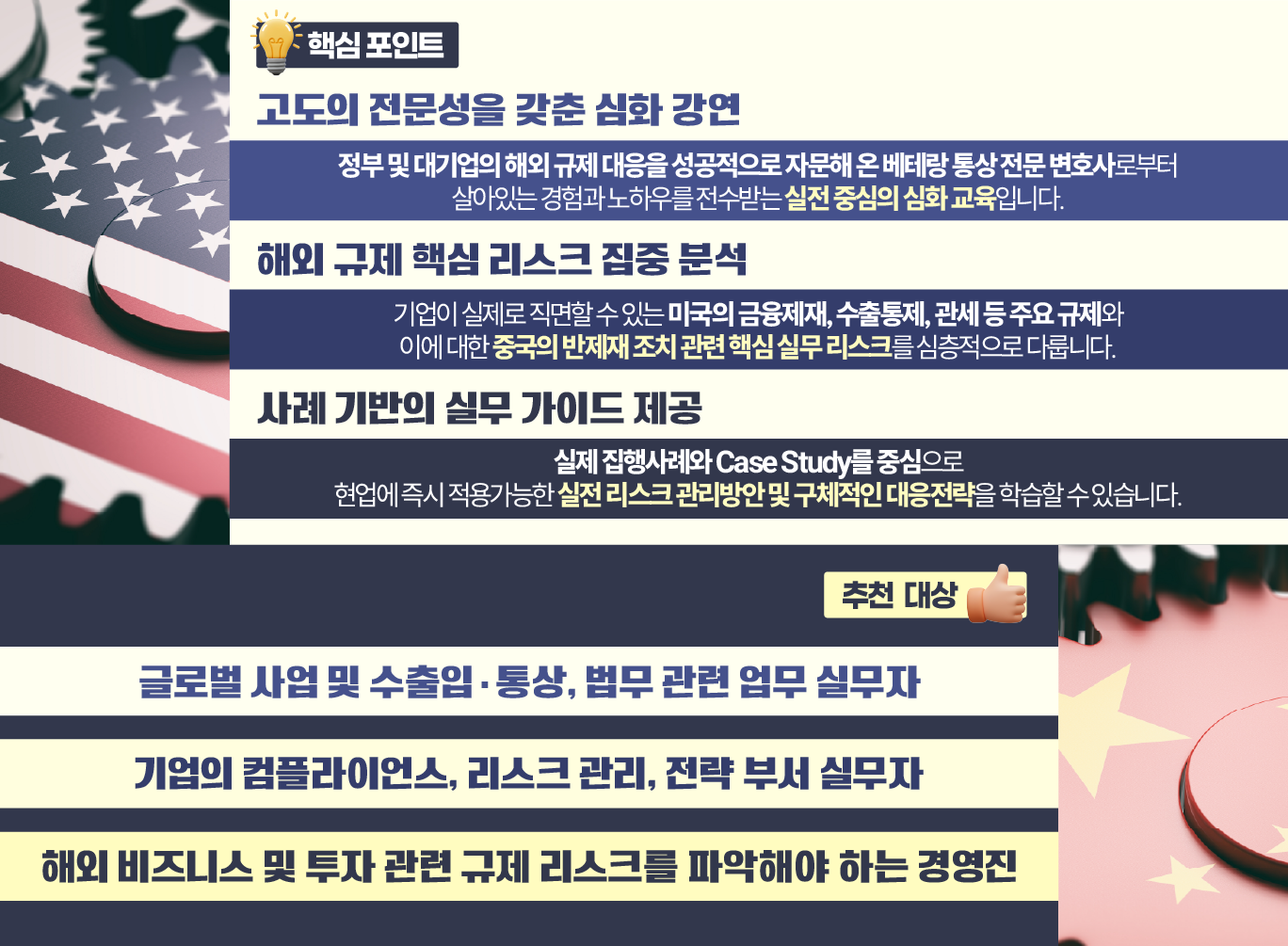 | 대 상 | 기업의 글로벌 사업 및 수출입, 통상, 법무, 컴플라이언스, 리스크 관리, 전략 부서 실무자 및 관리자, 사내변호사, 경영진 등 |