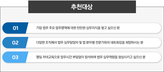 | 대 상 | 기업, 공공기관, 금융기관, 법무법인 등 법무실무 담당자 또는 법률실무학습을 원하시는 분 |