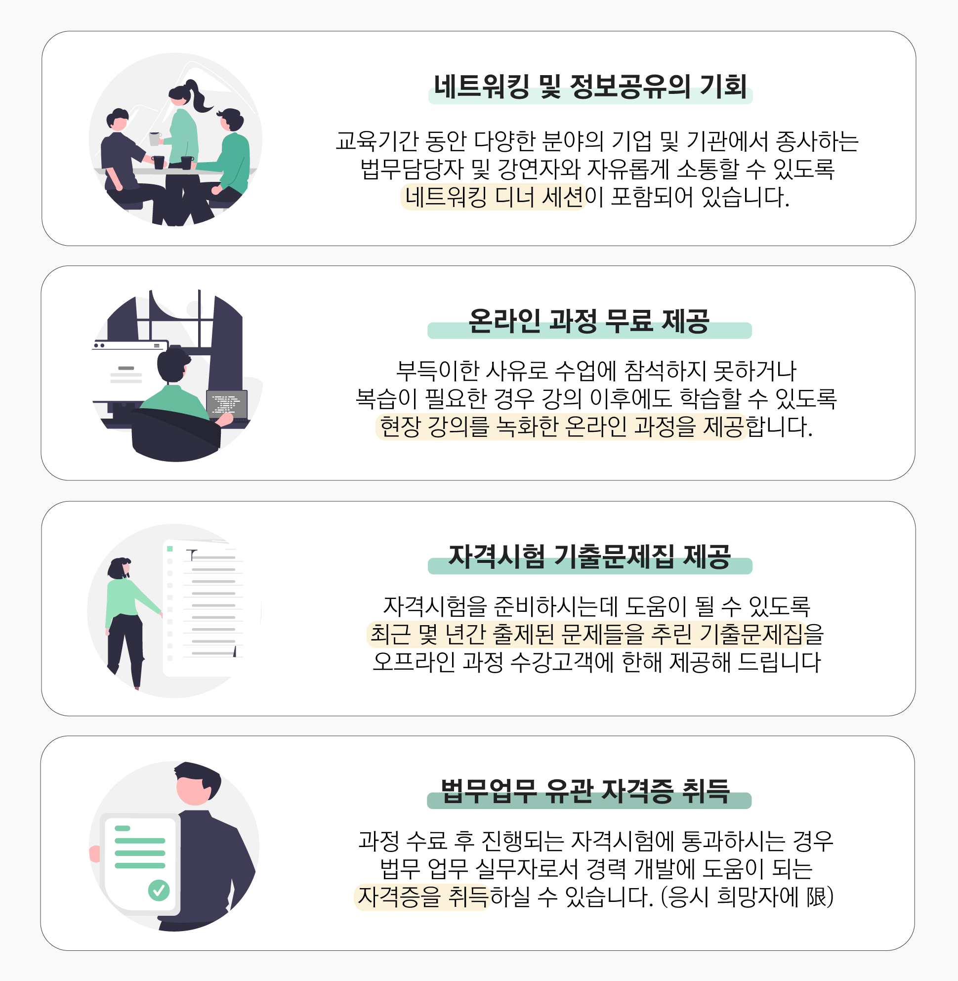 | 대 상 | 기업, 공공기관, 금융기관, 법무법인 등 법무업무 실무자 또는 법률실무학습을 원하시는 분 |