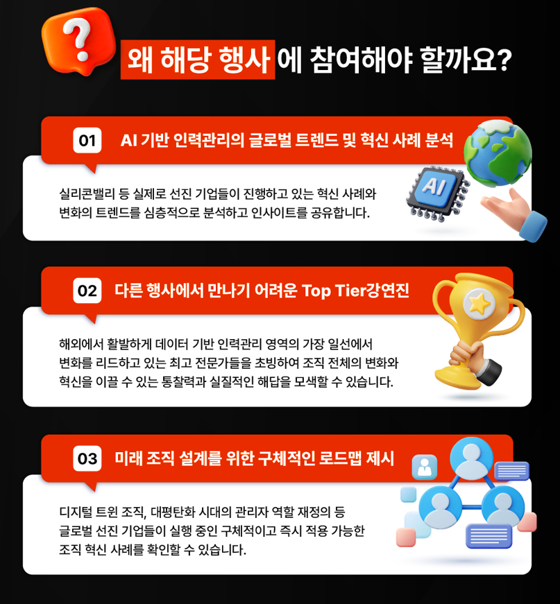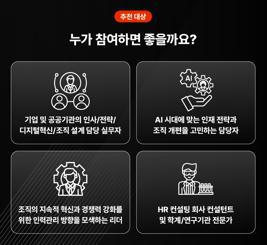 | 대 상 | 기업, 정부기관, 공공기관의 기업의 인사/전략/디지털 혁신 담당 관리자 및 경영진 등 |