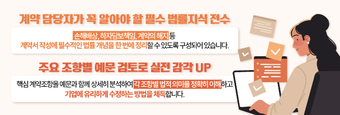 | 대 상 | 각 기업 법무/영업/관리/총무/기획 등 계약서 업무담당 실무진 및 부서장, 변호사 등 |