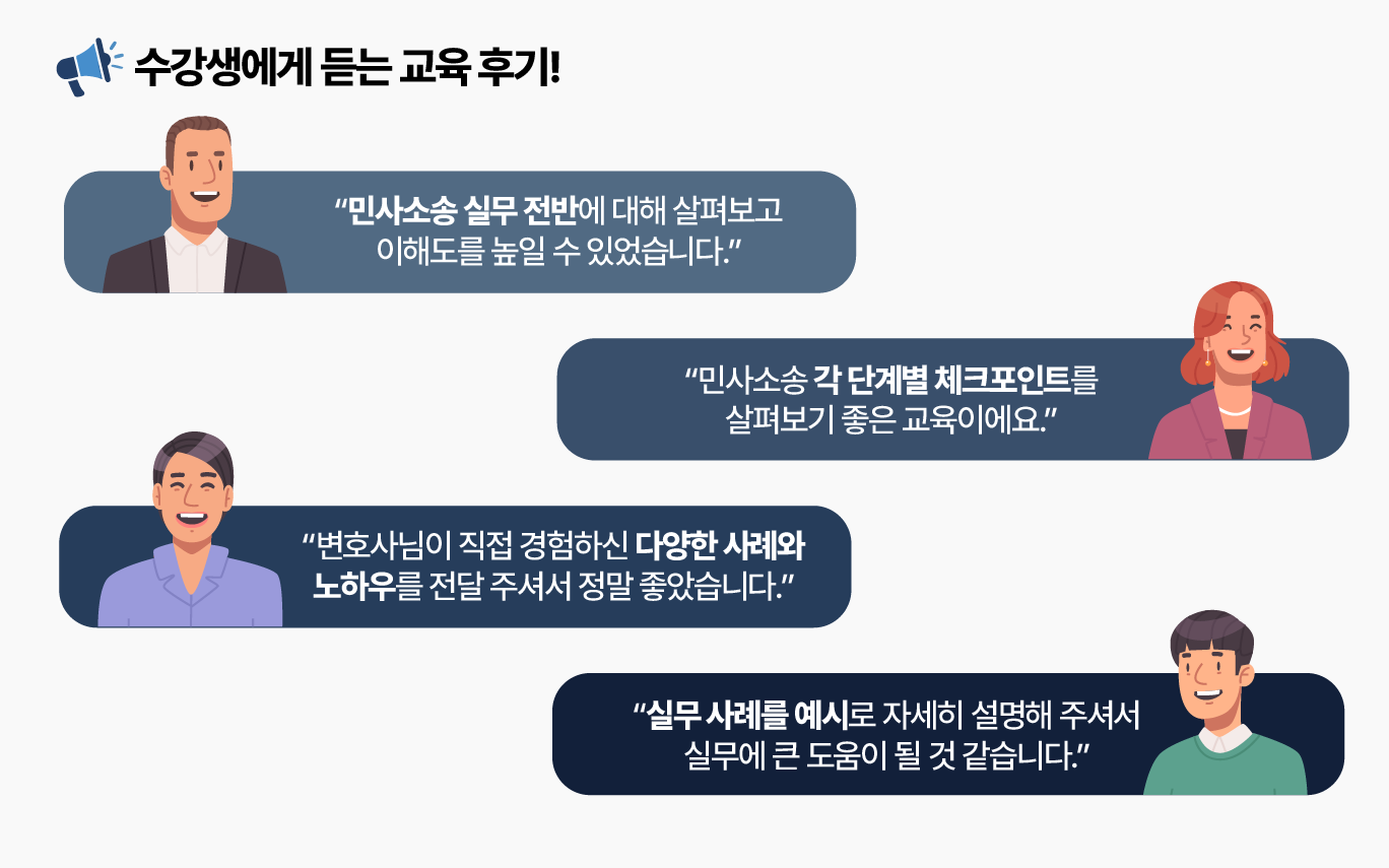 기업에서 관련 업무를 담당하는 실무자분들께서는 27년차 경력을 보유한 소송 전문 변호사의 강연을 통해 민사소송 실무지식을 체계적으로 학습하고, 사건을 제대로 다룰 수 있는 핵심역량을 업그레이드하시기 바랍니다.