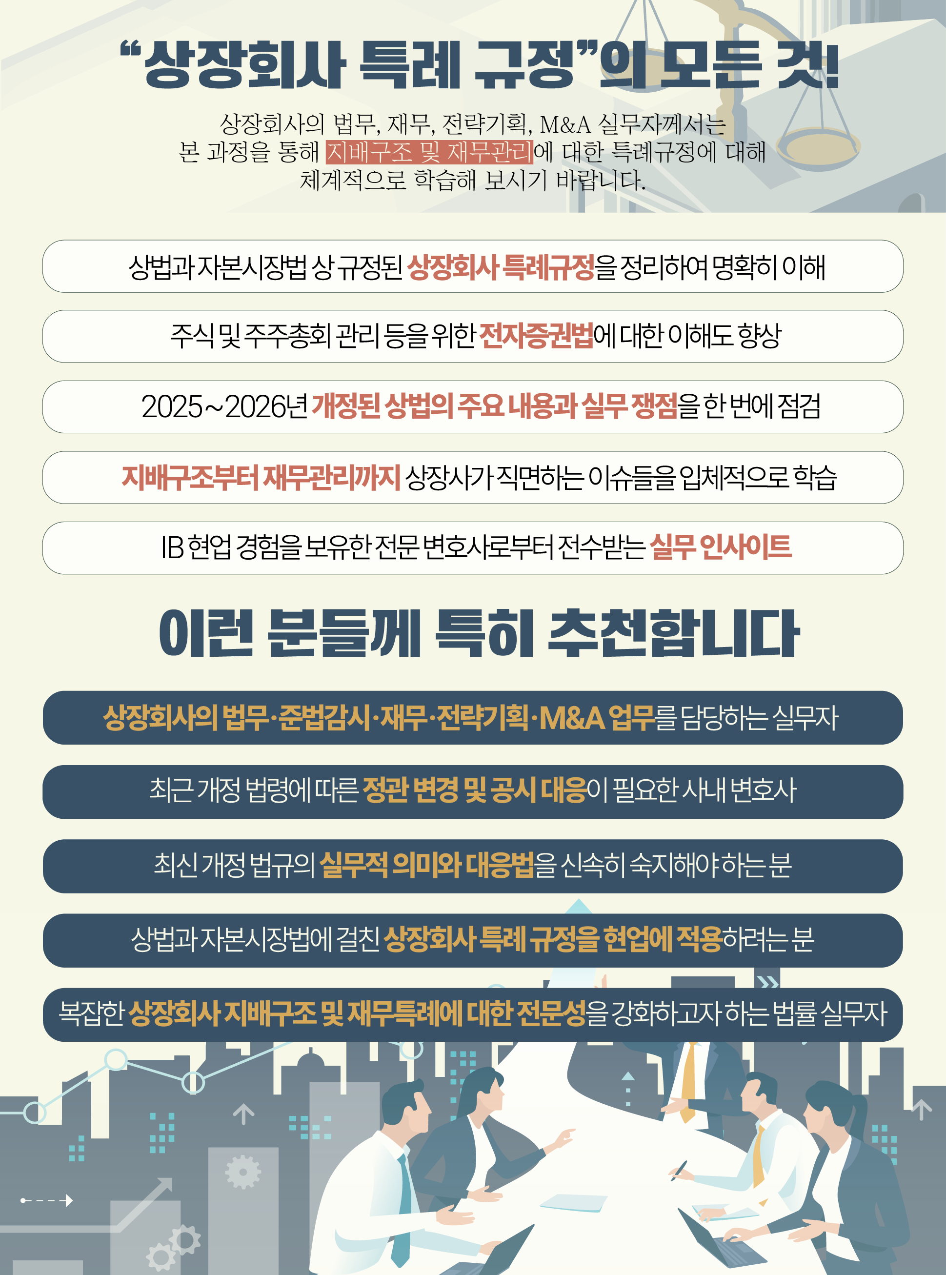 | 대 상 | 각 기업 및 기관의 법무, 준법감시, IR, 재무, 전략기획, M&A 관련 실무자, 경영진, 변호사 등 |