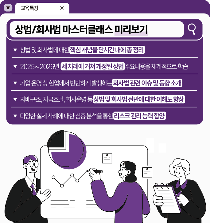| 대 상 | 기업의 법무, 전략기획, 재무업무 담당 실무자, 사내변호사, 경영진 등 |