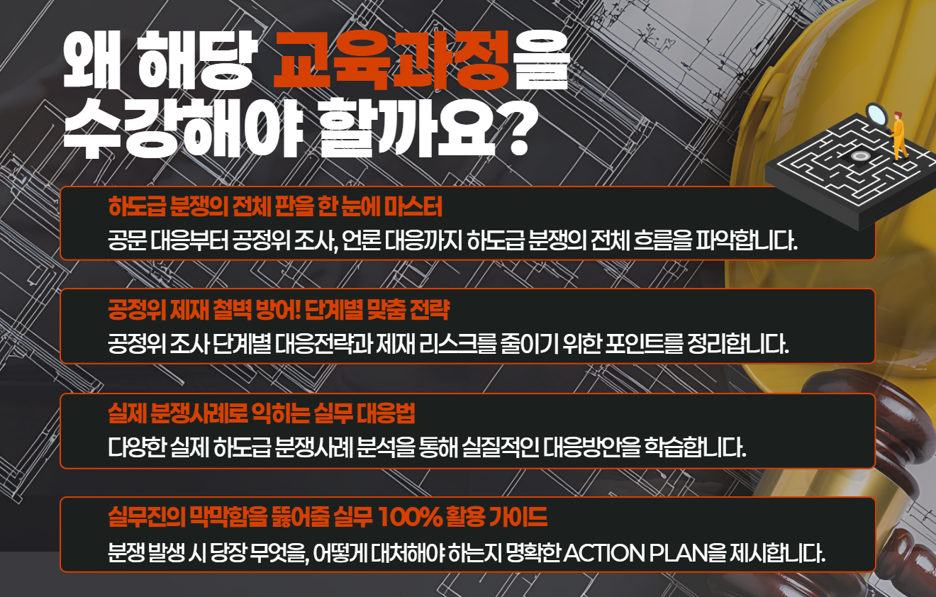 | 대 상 | 기업의 하도급 관련 업무 담당자, 하도급거래 분쟁의 처음부터 끝까지의 각 단계별 이슈와 대응 방안을 알고 싶은 임직원 등 |
